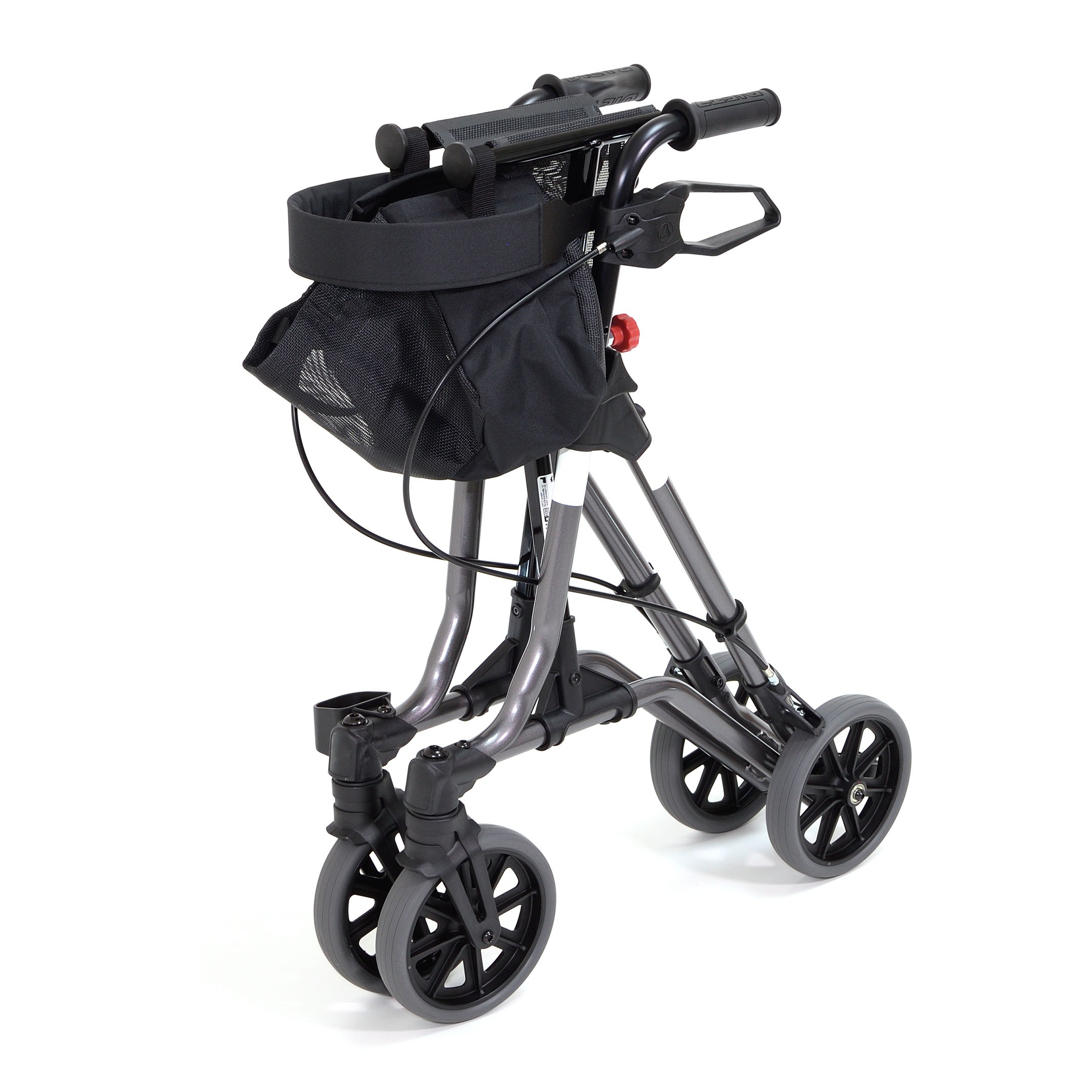 Andador plegable ligero con 4 ruedas, fresnos de maneta y ruedas delanteras giratorias en 360º. Ligero y resistente, con una cesta que resiste hasta 15Kg
