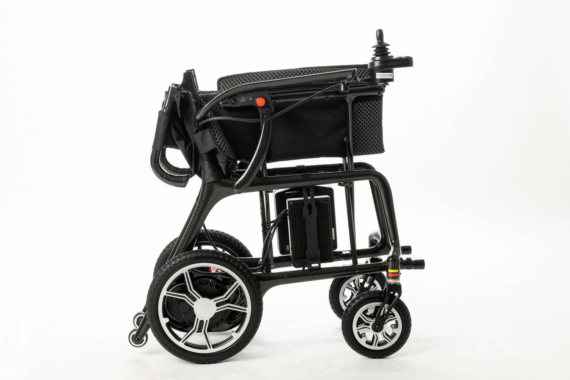 Fabricada en fibra de carbono. Es superligera y se pliega como una silla manual.